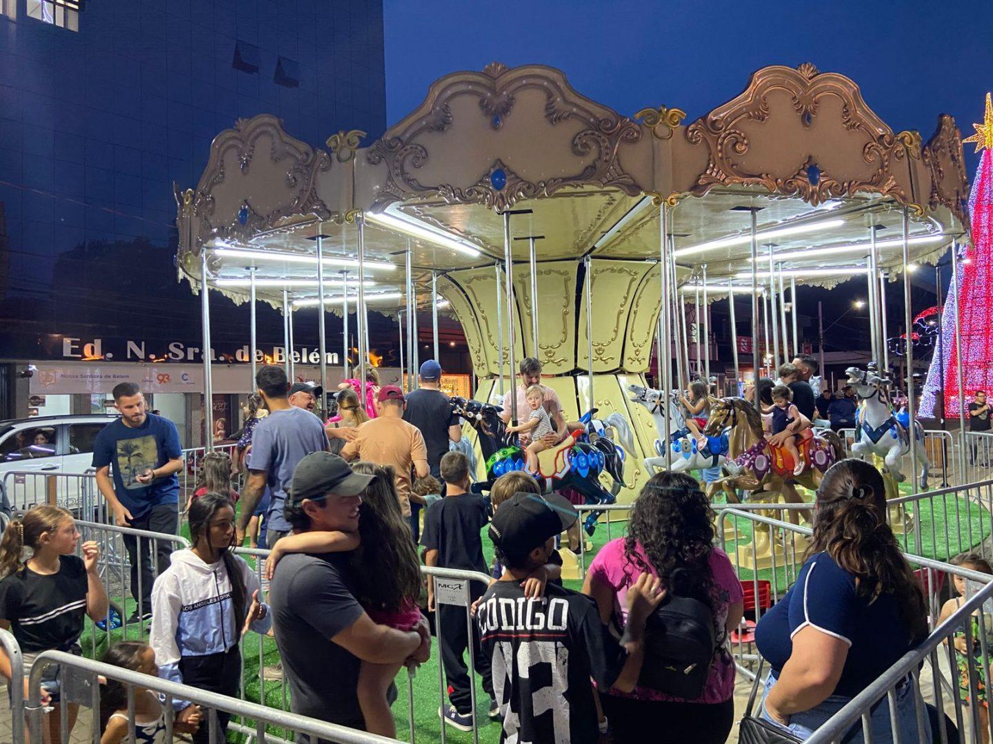 A magia do Natal tomou conta da Rua XV de Novembro na noite desta sexta-feira (5), quando a Prefeitura de Guarapuava abriu oficialmente ao público o Carrossel de Natal, instalado em frente à Praça 9 de Dezembro. A estreia da atração reuniu famílias e crianças que aproveitaram o primeiro dia de funcionamento do equipamento gratuito.